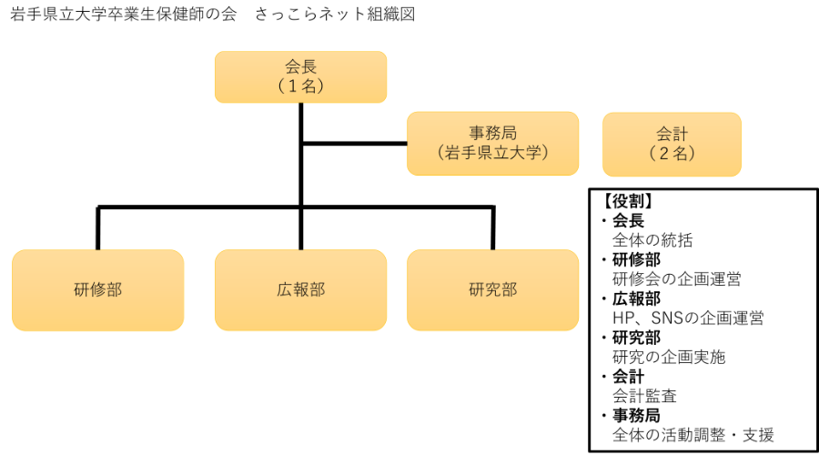 さっこらネットは、3年間の活動から参加者・協力者も増え、さらに、活動を発展させるべく、「研修部」「広報部」「研究部」を立ち上げ、以下のような組織体制を整えました。